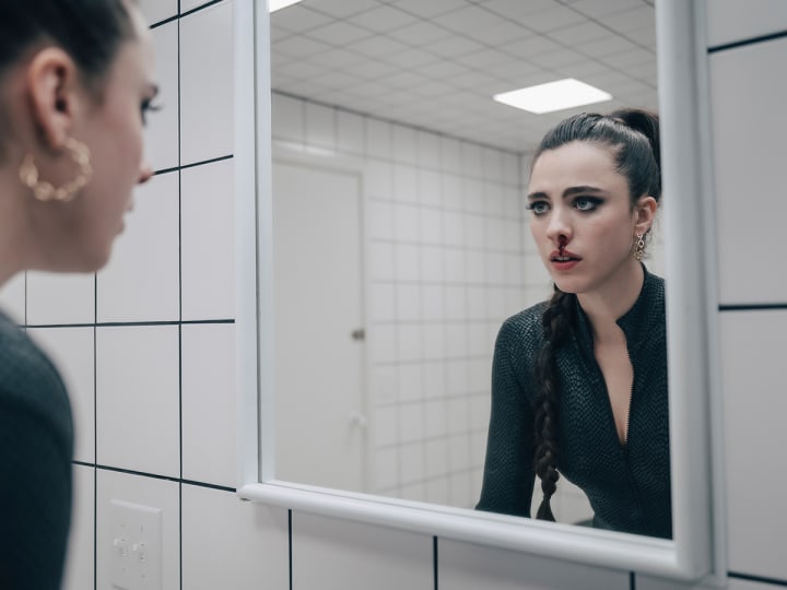 This game evokes a kind of Dr. Jekyll and Mr. Hyde, perverse and strange, or a human version of Fiona from Shrek: "By day I'm one, by night I'm another." What was predictable soon becomes apparent. The young version, played by Margaret Qualley, craves control, even if that means devouring the original version.