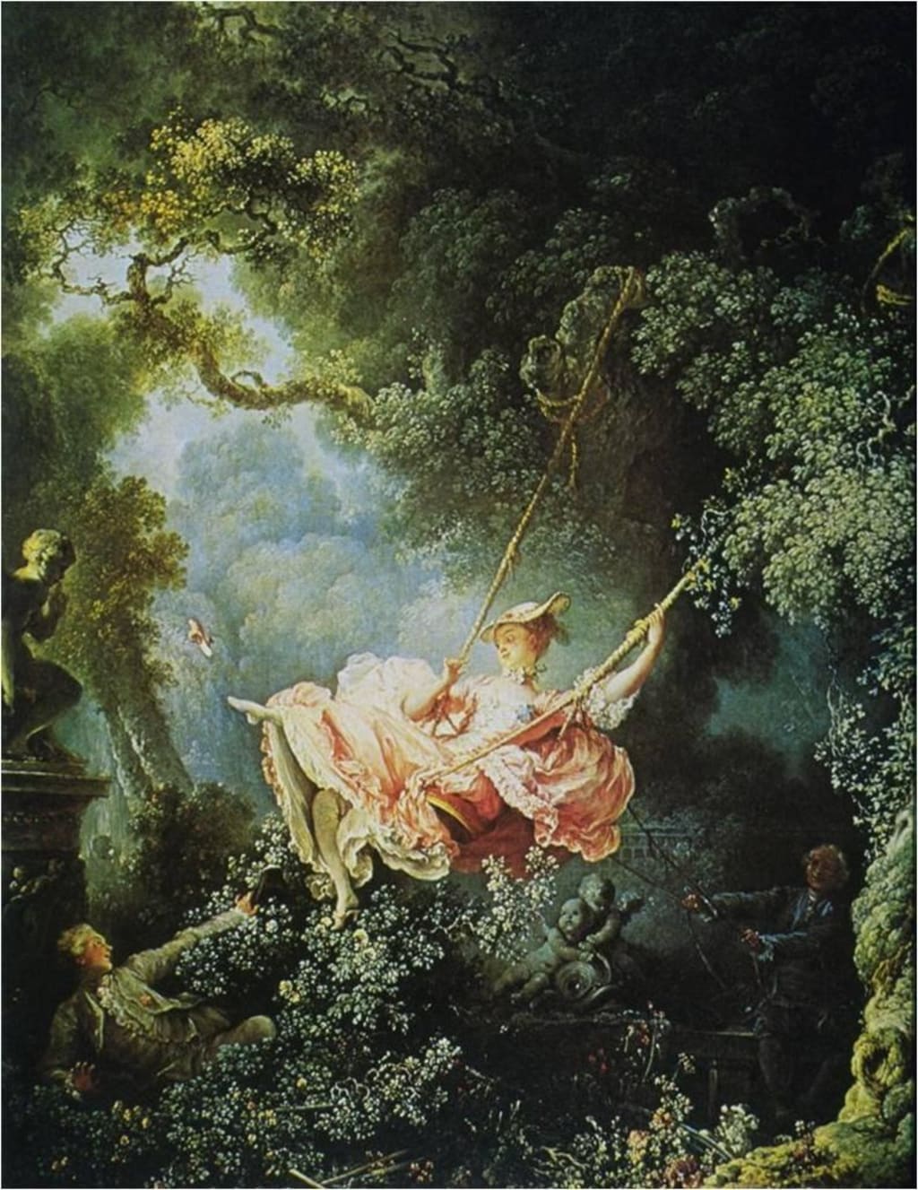 The painting features a young woman, wearing a florid pink dress, who is being pushed on a garden swing that is suspended from the branches of a tree. Unseen by the woman’s husband, who is doing the pushing, is his much younger rival for the woman’s attentions, who is half-hidden in the garden shrubbery but who has an excellent view of the woman’s legs as her skirts are thrown up by the motion of the swing. The painting is therefore highly frivolous and suggestive, which is one reason why it has been thought to be typical of the low morals and lack of seriousness displayed by the upper classes in pre-Revolutionary France.