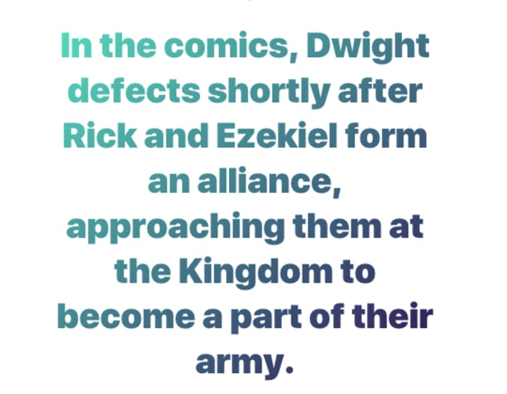 In the comics, Dwight defects shortly after Rick and Ezekiel form an alliance, approaching them at the Kingdom to become a part of their army. Dwight had to persuade Rick and Ezekiel into believing that he never fully trusted Negan.