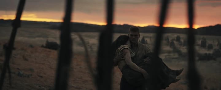 For the ending sequence of “The Road to the Spear”, a beautiful lasting shot was achieved as the twice-dragon-marked Rand carries a worn-out Moiraine out of Rhuidean whilst a stunning golden sunrise appears behind them, fulfilling the Aiel prophecy that the Car'a'carn is “He who comes with the dawn”.