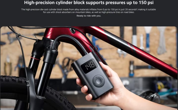 One of the standout features of the Xiaomi Air Compressor is its high-precision die-cast cylinder block made from alloy materials. This feature allows it to support pressures of up to 150 psi, making it suitable for a wide range of applications. Whether you’re inflating the high-pressure tires of a road bike or the shock absorbers on a mountain bike, this compressor can handle the task effortlessly. With inflation from 0 psi to 150 psi taking just 20 seconds, you’ll never have to worry about time-consuming pump-ups again.