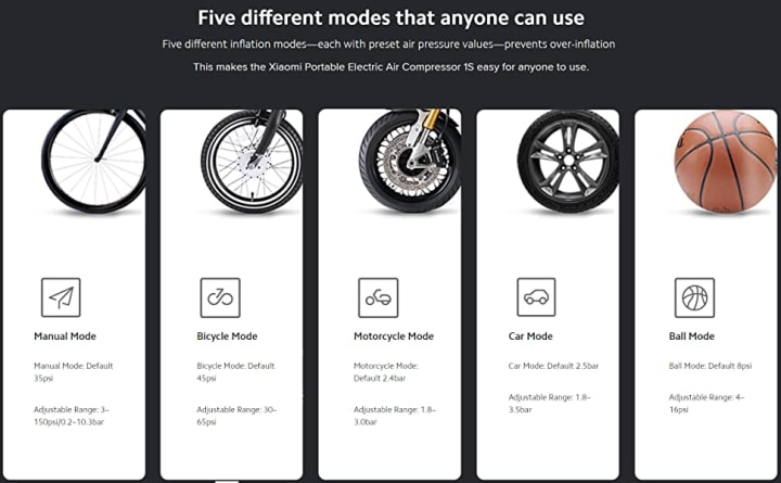 The Xiaomi Air Compressor offers five different inflation modes, each with preset air pressure values. These modes prevent over-inflation and cater to various needs, including cars, bicycles, motorcycles, sports balls, and more. By selecting the appropriate mode, you can ensure that you’re inflating with precision, while also avoiding potential damage from excessive pressure. It’s a versatile tool that anyone can use, regardless of their experience level.