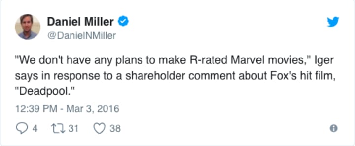 Feige's statement reiterates comments that Disney chairman Bob Iger made during a shareholder meeting when Deadpool was mentioned. Although Iger put his foot down, it was always hoped that Feige's sway in the company could win the Disney bigwigs over. However, with an R-rated film being so anti-MCU, you can see where Feige and Iger are coming from. The MCU already scores big in the box office takings, while the upcoming Thor: Ragnarok looks like it will continue their winning streak.