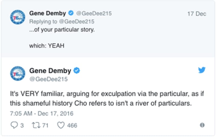 "Of course Cho was polite in her emails; if people of colour weren't polite every time we're confronted with problematic behaviour by powerful white people, we'd be rioting every hour of every day."