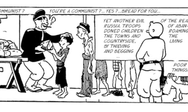 In accordance for the political purposes for which the story was commissioned, Tintin’s interactions with the natives reflects the belief of the ‘White Man’s Burden’, the ideology that underpinned the European colonial project which posited that Europeans had a moral responsibility to help the cultural, religious and technological advancement of indigenous peoples around the world--a theory that conveniently ignores the many benefits European states stood to gain by conducting such projects, notably an abundance of natural resources and new markets for consumer goods. True to this fashion, Tintin busies himself by assisting the natives whenever possible, nonchalantly demonstrating the positive changes strong-willed European men like himself can make in the lives of these charming but simple people, without once acknowledging the rewards his countrymen would continue to wreap. Compared to Land of the Soviets, the messaging is actually very subtle, but any discerning reader would conclude that Tintin in the Congo is colonial propaganda first and foremost.