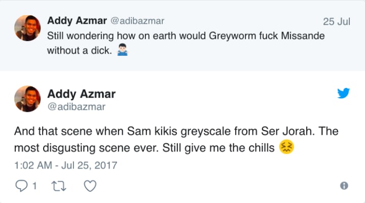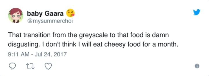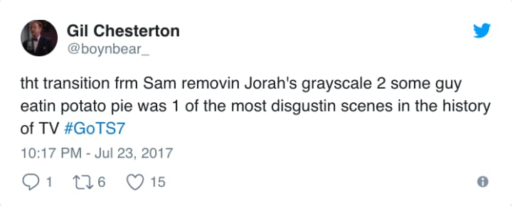 Ok can we talk about the scene change from Sam removing Jorah's greyscale to the guy taking a bite of his pie?? Absolutely disgusting— kbro (@kirstinbrown58) July 24, 2017