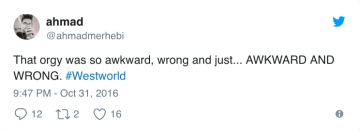 Secondly, to those complaining that 9pm on a Sunday is not a suitable time to show graphic nudity: it is post-watershed, and Westworld is no show for children. There were a few tweeters saying how it was awkward watching the show with their parents, but so is watching Game of Thrones.
