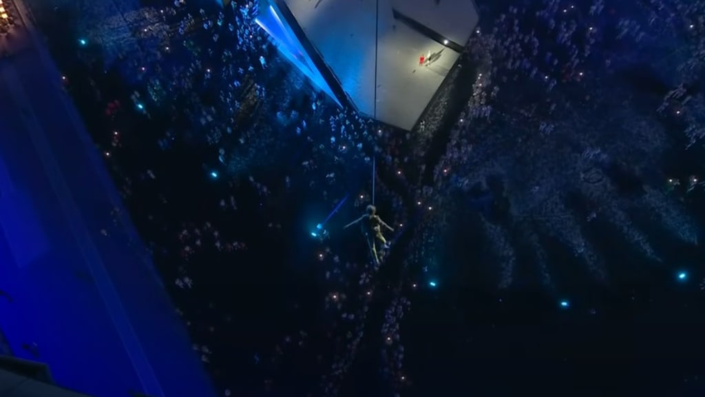 As the ceremony reached its peak, the stadium lights dimmed, and all eyes turned skyward. Suddenly, Tom Cruise appeared, rappelling down from the top of the Stade de France. The "Tom Cruise Olympics" stunt had officially begun, and the crowd erupted in applause as the Hollywood star made his way down with flawless precision.