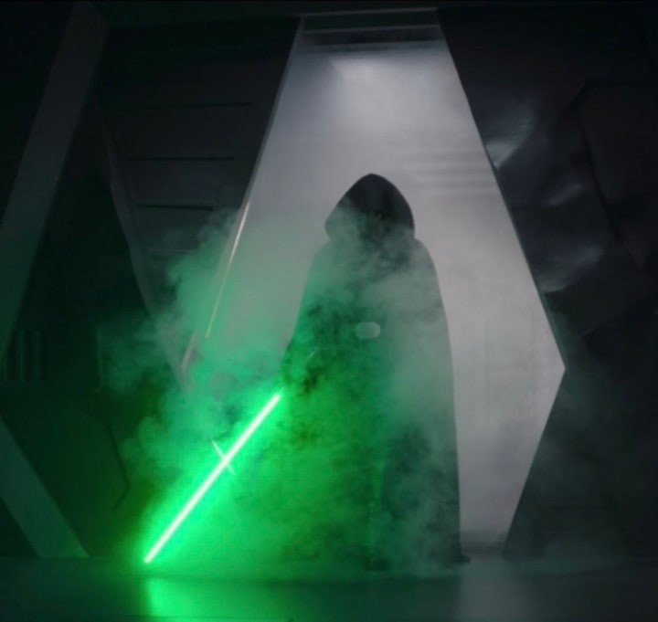 Well okay then... in the midst of being surrounded by a squadron of dark troopers a lone x-wing lands aboard Moff Gideons cruiser, a figure in a dark cape wielding a green light saber and black clothed hand...