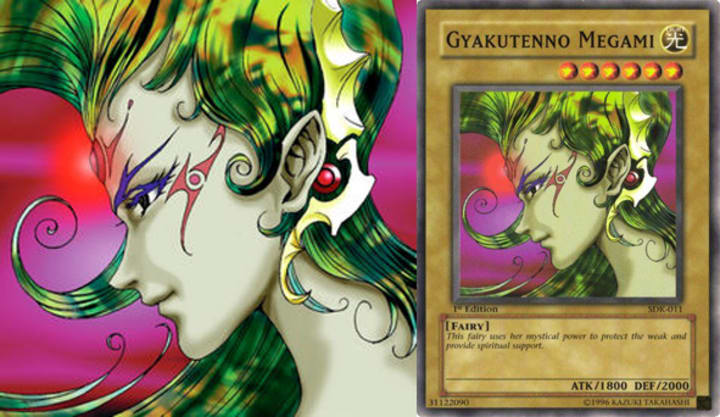 Green hair—don't care. The most famous old-school profile and you know she bought that nose. Stunning artwork, form the majestic make-up to the ear-piece to the glowing face jewels. Gyakutenno Megami has an alternative artwork, has been featured in the trap card Aegis of Gaia, and also has a retrain; Goddess Of Sweet Revenge.
