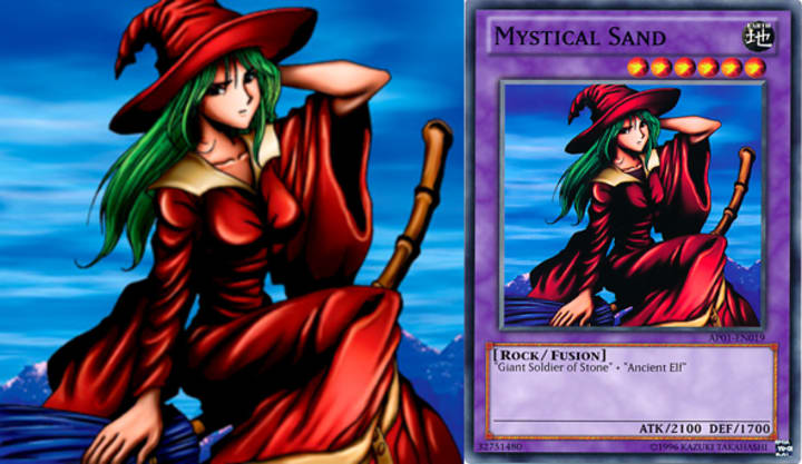 From Mystical Elf, to Mystical Sand. If you have ever played Yu-Gi-Oh! - Forbidden Memories on PS1 as a kid, you probably already know why I love this card so much. The only thing you needed was a female-presenting card and anything that looked like a rock and BAM! You have a 2100 ATK beater gracing your field.