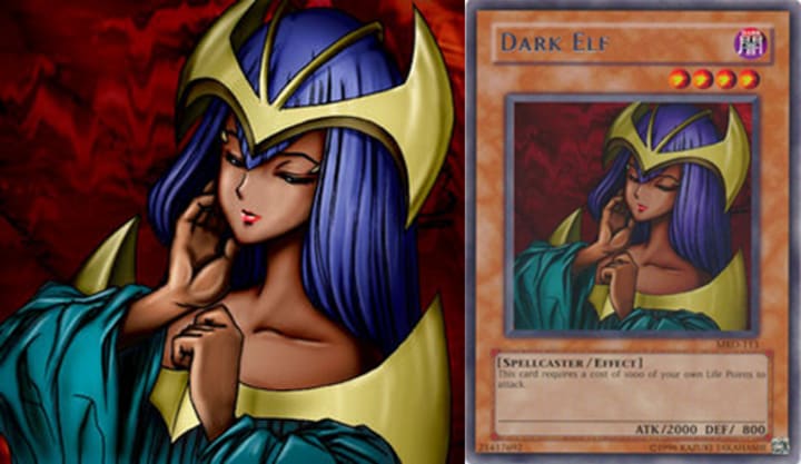 Dark Elf, unlike Mystical Elf, has seen competitive play. During the old-school days, being able to summon a 2000 beater without a tribute was a great asset. Yes you had to pay a pretty penny to be able to attack but even if you didn't want to do that you could just let her be on the field to intimidate your opponent.