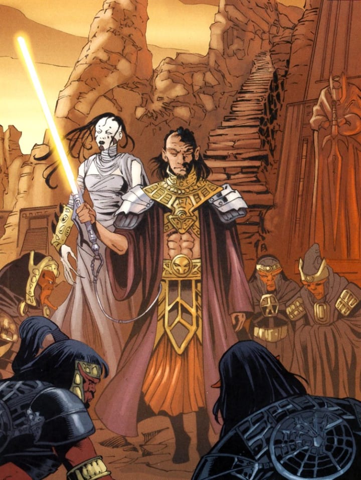 He settled on Yavin 4, making the temples that would survive until the era of the movies, and after practicing his alchemy and honing his skills, he went into hibernation for 600 years, as he was awakened by Freedon Nadd, who claimed his secrets before slaying him.