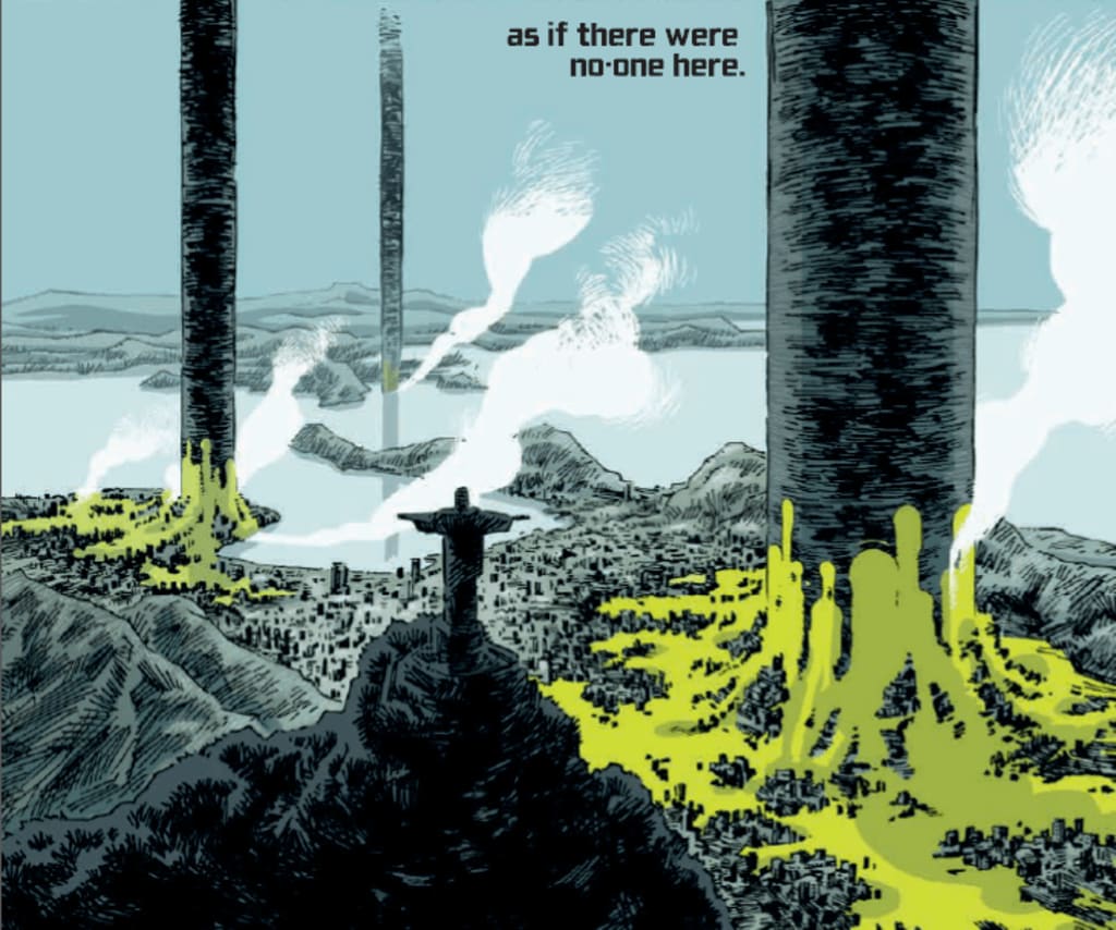 Warren Ellis’ Trees is a fascinating, sprawling series that operates on a global scale. Like his Freak Angels series from Avatar, he’s openly channelling British Science Fiction author, John Wyndham, from the very outset of this book. Taking the premise of an alien invasion, Trees chronicles life ten years after a number of alien, black columns arrive on Earth, and do... nothing. They loom over human cities, silent and apparently inactive, apart from the occasional discharge that leaks into the planet’s biosphere. As a consequence, the story Ellis is crafting is both the story of human reaction to these aliens and of what happens as the Trees begin to change. I must say that my initial feeling with regards to the structure of this comics series is that it is a novel, one that builds slowly and inexorably towards a point where there will be convergence.
