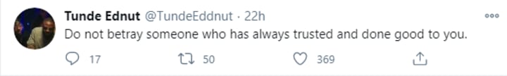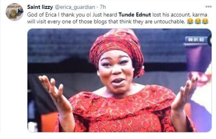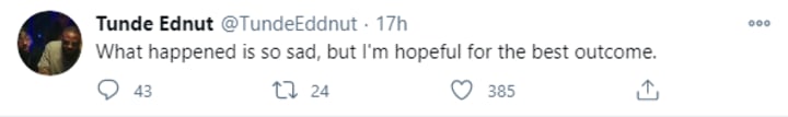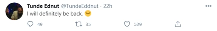 Taking to his Twitter page that has 131,000 followers - a far cry from his over 2 million on Instagram, Tunde Ednut wrote: