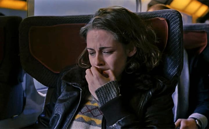 Many of Stewart's scenes were also done without dialogue. Take for instance, an integral scene on the Eurostar Maureen takes on route to London. Receiving disturbing-turned-sinister text messages from an unknown caller (Is it a stalker? Is it her dead brother texting from the grave?), what could have been a boring sequence of modern-day communication is turned into a believable suspenseful situation thanks to Stewart's masterful way of bringing a bag of emotions to the mundane ritual of text messaging. In fact, most of the time, all you can see here are close-ups of her anguished face or her twitching hands texting furiously away.