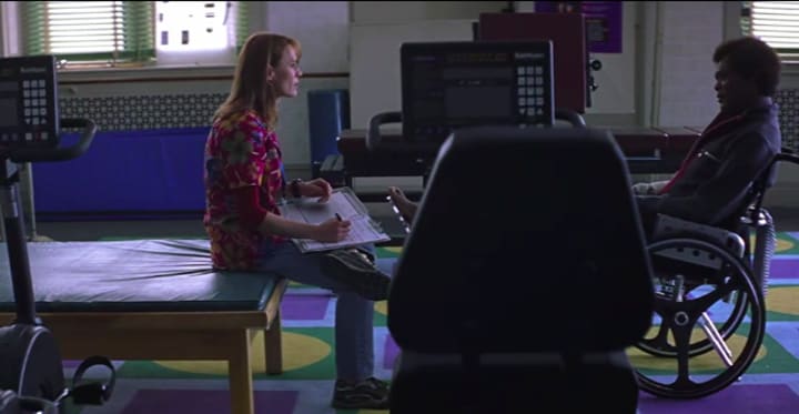 First, after Elijah falls down a flight of stairs, he is sent to physical therapy, and somehow ends up with David's wife, Audrey, a physical therapist.