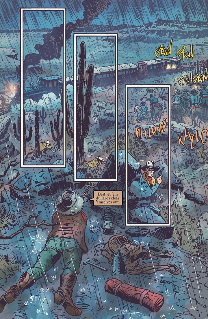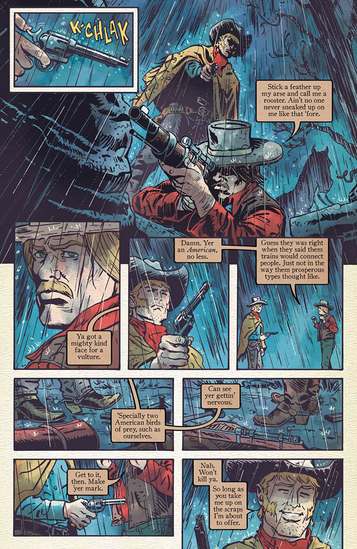 On the run after a frenzied heist, Silvano’s plans have gone out the window. Battered and bruised, he’s got a raging dust storm and an angry brotherhood on his tail, and both will stop at nothing to kill him. Meanwhile, Solomon Eaton finds himself pinned down by a legendary gunslinger and with his own heist gone awry. Cornered and desperate, Sol must form a plan with men he can’t trust to get across the border and back home to America.