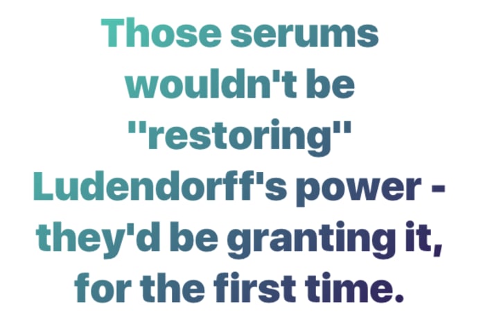 But that doesn't quite fit. After all, those serums wouldn't be "restoring" Ludendorff's power, they'd be granting it, for the first time. I think there's another twist to the tale: