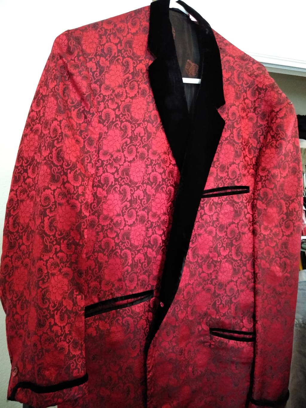 A couple of weeks went by, and a friend invited me out for a day of thrift shopping, just to see what treasures there were to discover. I combed through and picked out some old books and movies, and then offhandedly started wandering through their clothing section. At the back wall, behind all the hanging racks, stood an old wardrobe with a sign labeled "vintage items- handle with care". I love history and theatre and costuming, and I'm always fascinated by the stories behind the fashions of different eras, so I was instantly drawn to this old hutch and its contents. I started leafing through old dresses and shirts from times gone by, when suddenly there it was- an absolutely gorgeous, pristine red silk smoking jacket with black velvet detailing made for a tall, broad-shouldered man. I checked the price tag and almost had to sit down for a moment. It was only three dollars. Without hesitation, I grabbed it and made my way through checkout, certain my luck could not be so good and they'd tell me it was mislabeled and really cost $300 rather than $3, but no such setback came to pass, and I was free and clear with my amazing find in tow. This was the missing piece of the puzzle.