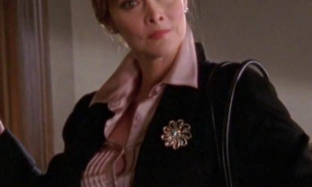 I have to mention this. Not only was Erin Gray nice enough to appear in a Lifetime film and play the villainess, she was also gracious enough to don the famous "hoodie of evil" as well. A flashback to the night of Tippy's death showed Brianna committing her latest theft, and as we see, the villainess dons a black hoodie to hide in plain sight. It was epic to see Brianna's villainy in action, and that shocked expression when she sees Tippy and witnesses her fall was more amazing acting from Gray. Overall, Brianna was quite a memorable villainess, and we have Erin Gray to thank for this.