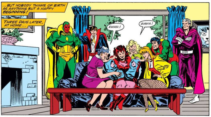 Vision is still taken away briefly for tests, but Wanda, displeased with the treatment of her Husband, ends the tests. To keep Vision safe, and prevent further Government threats to The Avengers, the couple leave the team, deciding to settle down for a more quiet life in suburbia. It is during this time that Wanda magically conceives and gives birth to Vision's children, Tommy and Billy.