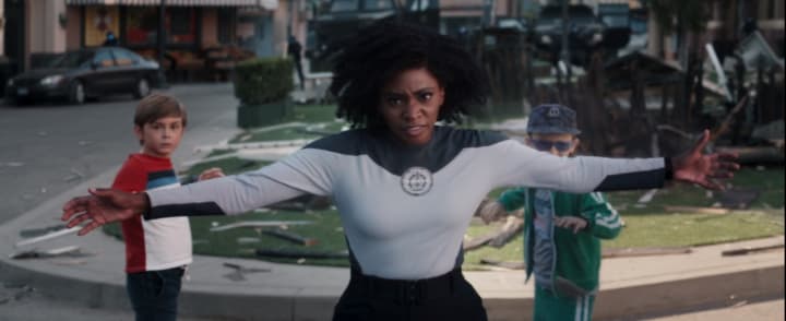 With Wanda doing battle with Agatha, and Vision fighting White Vision, Tommy and Billy are left to deal with the invading S.W.O.R.D agents. They appear to be winning, but while distracted with celebrating their victory, Hayward attempts to shoot at them. Monica Rambeau throws herself in front of the boys, with her new powers instinctively converting her body to energy to safely stop the bullets. This is followed by a cute moment in which Monica and Billy compliment each other on their abilities.