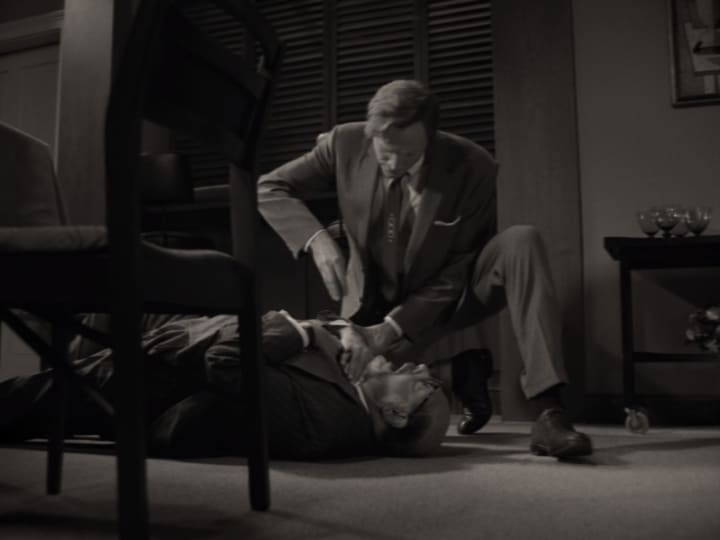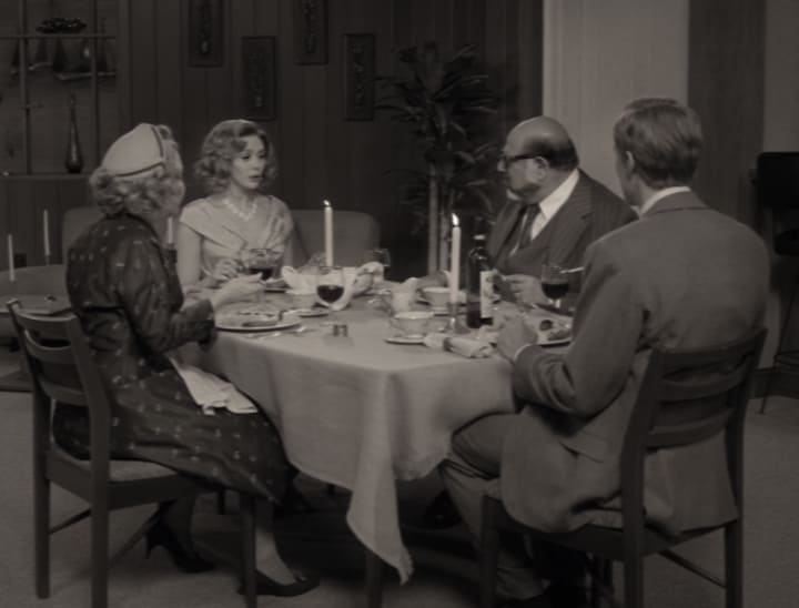 The dinner scene soon becomes one of the most unsettling scenes in the series so far, as Mr. Hart begins to choke, while his wife implores him, and then, for some reason, Wanda, to 'Stop it'. Though Mr. Hart is clearly struggling, the other characters fail to do anything about it, until Wanda gives Vision instructions.