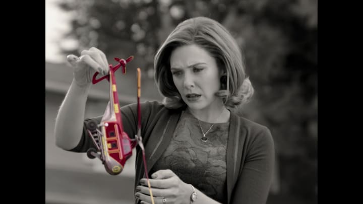 In the second episode of the season, titled 'Don't Touch That Dial', Wanda can be seen waving off her husband Vision as he heads to a Neighborhood Watch meeting, but she is taken aback by a splash of colour in her otherwise 60's black and white world. Though the idea of colour in the season isn't unusual to us as viewers at this point, having seen the S.W.O.R.D. base watching Wanda in the episode prior, this acts as the first time that we, and Wanda, witnesses colour within the Hex. Though the helicopter itself is later explained as one of Jimmy Woo (Randall Park) and Monica's attempts to breach the Hex, it's appearance in the world is one of the first times in the season in which Wanda appears genuinely startled or out of touch with her otherwise overly perfect day to day.