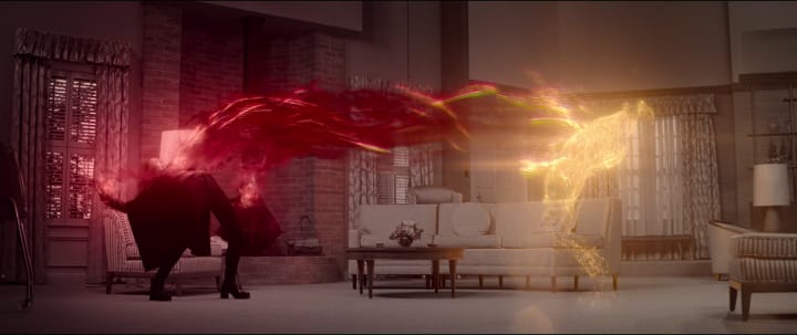 At the end of the episode titled 'On A Very Special Episode...', Vision (Paul Bettany) confronts Wanda about the suburban world they're living in and her part to play in the potential suffering of the townsfolk. Whilst Wanda initially dismisses the claim, there are some truly powerful performances going on from the two actors whose love for eachother quickly shifts into confusion and rage. What is rather a nice touch, mostly for the audience (and perhaps Darcy) is when Wanda responds to Vision's claim she can't control him with "Oh can't I," before rolling the credits of the episode. Whilst this initially came across as a rather funny moment, this dismissal of Vision's claims both in real time and in her sitcom suburbia highlights for us as the viewer that Wanda is more in control of this reality than we first though. Breaking out into a proper 'super-hero' marriage argument, the pair both levitate off the ground shouting at eachother, giving us a gentle reminder that whilst they live in what is an idealised human world, their heroic backgrounds will always come to the forefront no matter how normal they try to act.
