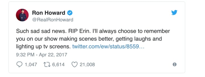 Moran's costars, Ron Howard and Henry Winkler, tweeted their condolences shortly after TMZ broke the news.