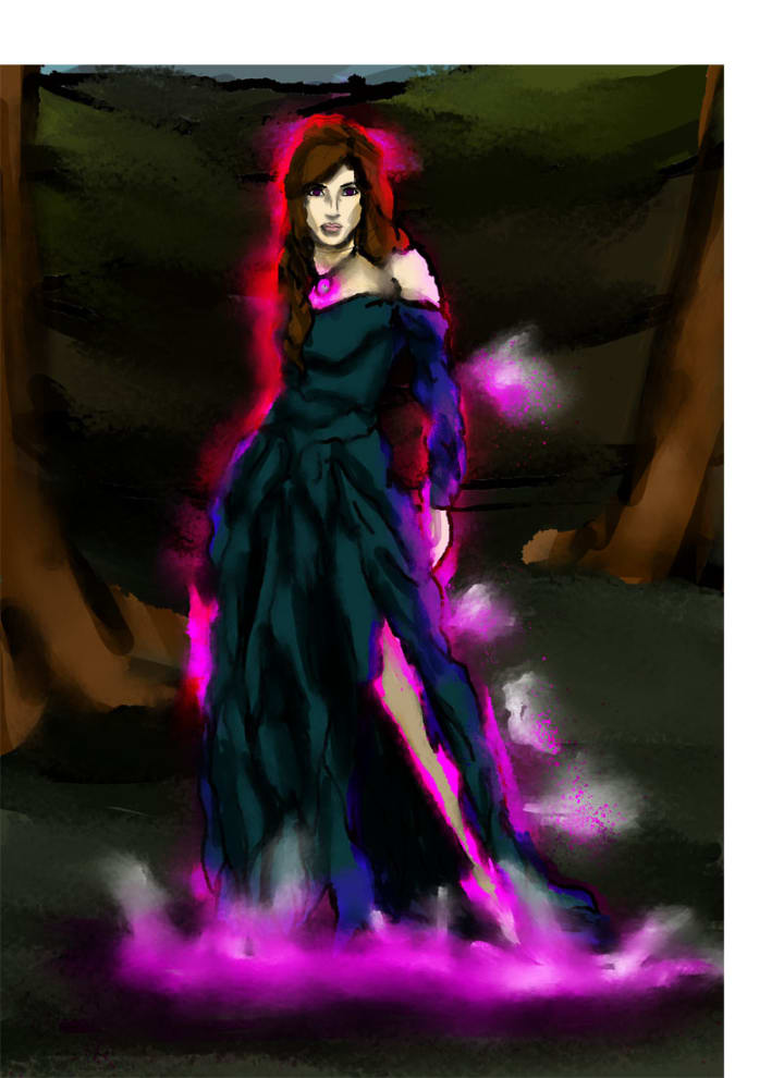 “Come here, my dear.” She called over her shoulder. An even darker presence sprung forth, making Randolf’s very blood turn ice cold. Silence overcame the Forest and a shadowy figure emerged. At first he thought it would be Gerrick, but horror struck his heart when he realized it was a female figure. Her dress was tattered and dirty from a struggle, her hair loose and falling around her face. The amulet she treasured pulsed a strong evil aura similar to Gertrude's. Her head was bowed but he knew it was her.