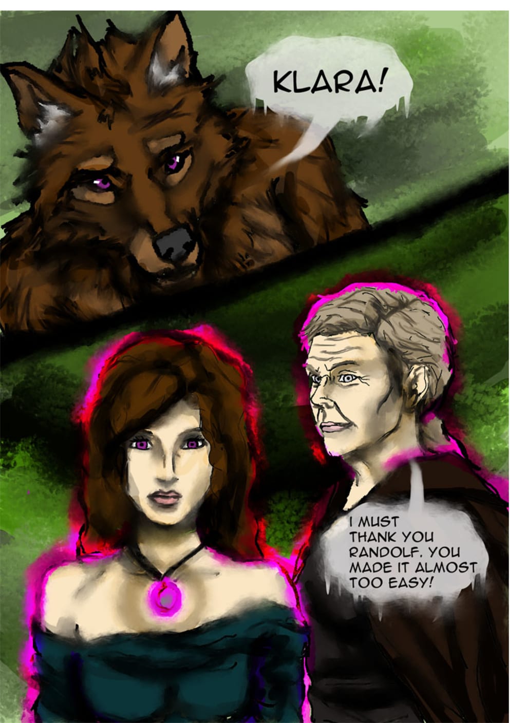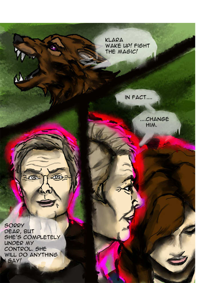 “Sorry dear, but she’s completely under my control. She will do anything I say. In fact...” Pausing she told Klara, “...change him.” Klara slowly looked up and Randolf saw her usual beautiful turquoise eyes were purple and glazed. She raised her hand, dark magic glowing at her palm. Randolf’s body stiffened then seized, every muscle contracting so hard that he could barely even yell out. Slowly he morphed back into his human form, nearly passing out from the pain.