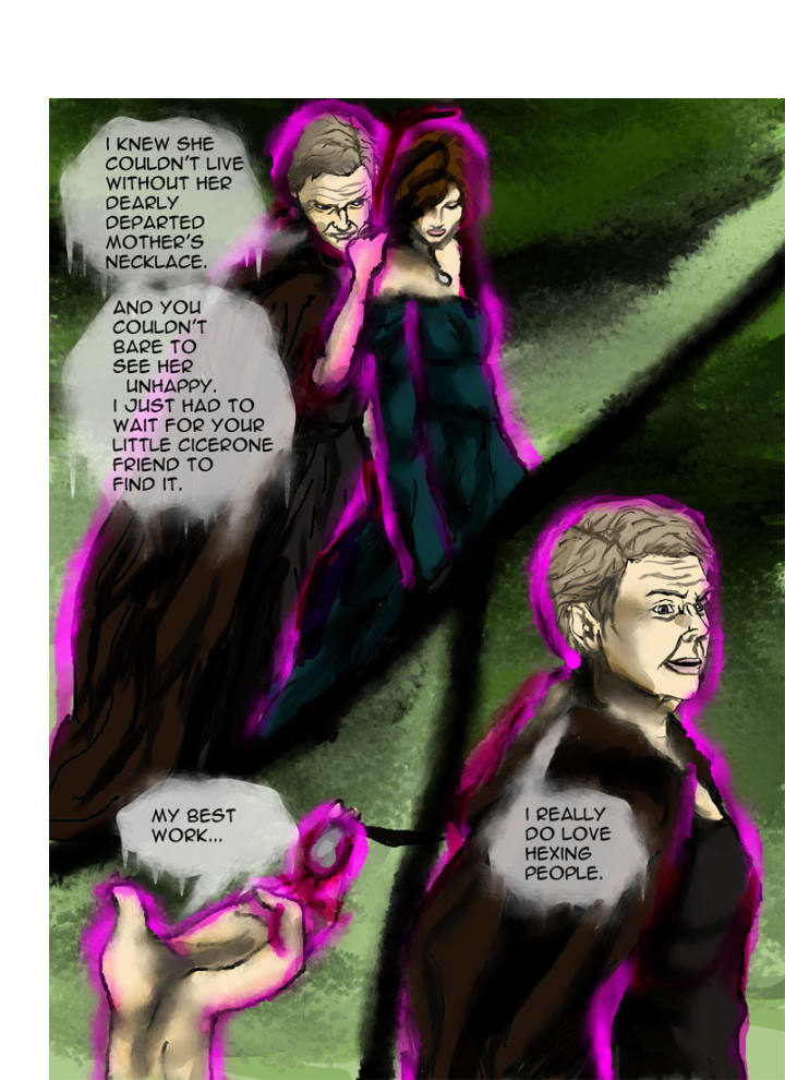 “I must thank you Randolf, you made this almost too easy.” Gertrude laughed, walking around her niece and clasping her shoulders. “I knew she couldn’t live without her dearly departed mother’s necklace, and you couldn’t bear to see her unhappy. I just had to wait until your little cicerone friend came to find it.” She touched the amulet and sighed. “My best work really, I do love hexing people.”