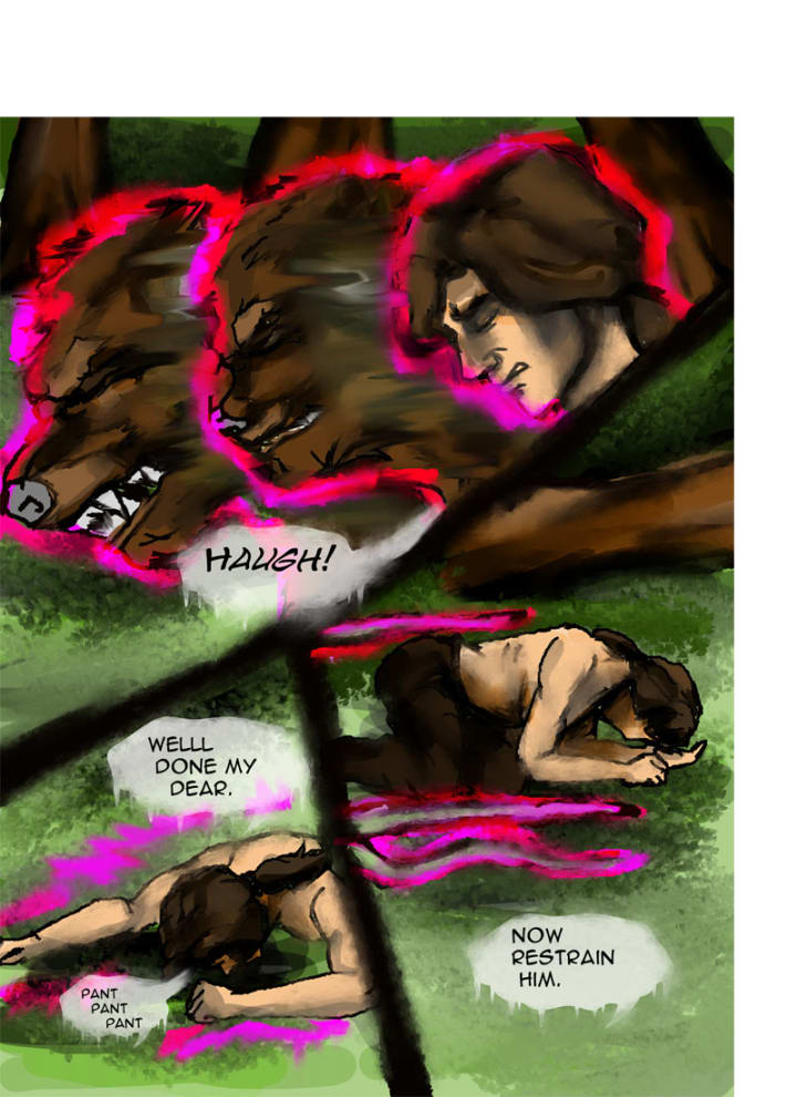 “Well done, my dear.” Gertrude whispered to her niece as Randolf panted, dripping in sweat. “Now, restrain him.” Again Klara raised her hand and the bear trap sprung open while vines from a nearby tree grabbed hold of the wolf, tying him up from the neck down then pinning him to the tree.