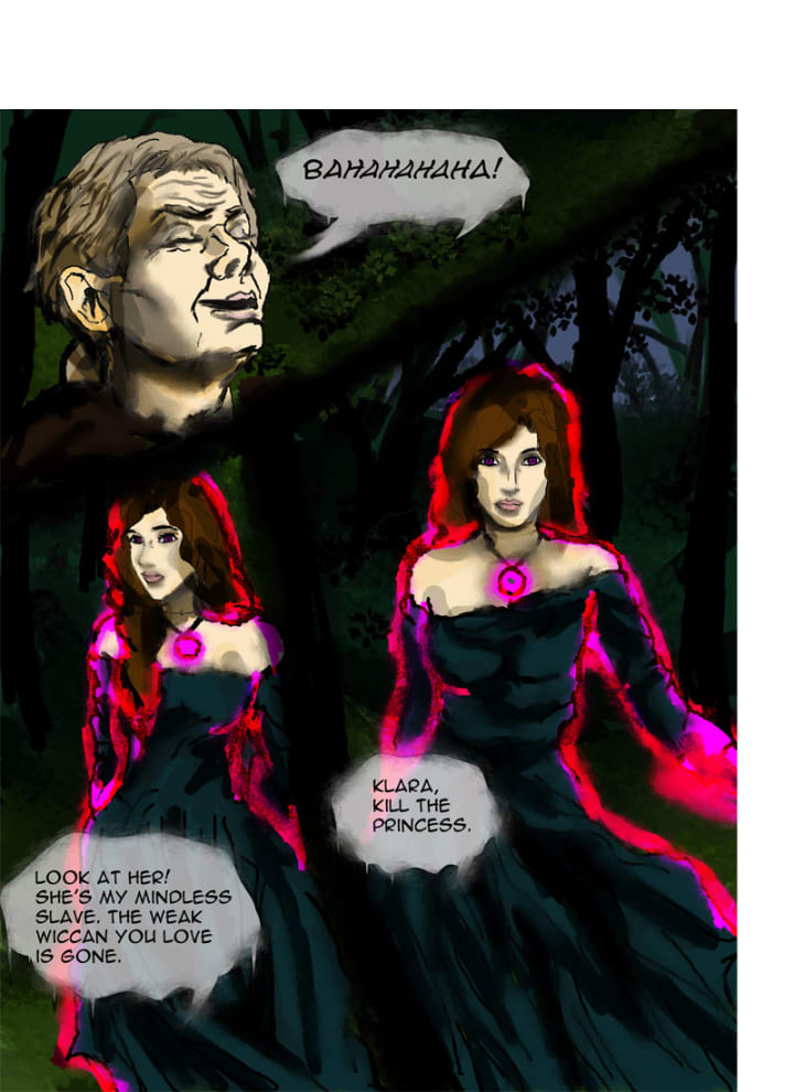 “Look at her,” she commanded the princess. “She is my mindless slave. The weak Wiccan you love is gone.” Klara stared blankly at her friend, making the fairy shiver heavily. There truly was no sign of Klara in her void gaze. Gertrude stood up then said to Klara, “Kill the princess.”