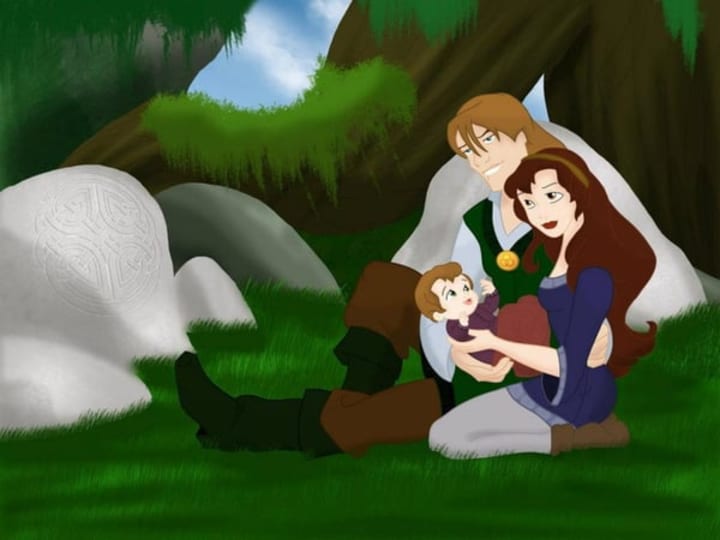 Choosing to ignore the Hunchback sequel, here are Phoebus and Esmerelda with their boy, Alain, which means little rock. I love how big and green his eyes are, like his moms, but that messy golden hair will break many a young gypsy girl's heart.