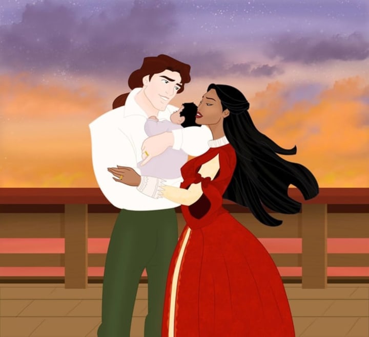 Disney ended up going slightly correct into their history when they brought in John Rolfe in Pocahontas 2: Journey to a New World. Wherein Pocahontas meets John Rolfe and ends up with him and leaving for England. In real life, they did have a son named Thomas, and here are the two characters with that child.
