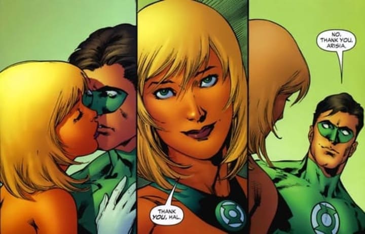 Hal Jordan, the Green Lantern, is generally seen as being on an equal footing with Superman when it comes to relying on a high moral standing and righteousness, so how could he possibly have a relationship that is innappropriate? -- Well, this is how. Enter, Arisia - an alien who came to Earth to assist in fighting off the countless villains here. She, like Shadowcat to Colossus, made it implicitly clear that she was attracted to Hal. Hal, with his high sense of right and wrong, shot Arisia down right away saying that he was twice her age. She ran away in tears and that should've been the end of it right? - Yeah, not so much. Arisia had other plans, she used her rings power to age her body into a woman in a matter of hours.