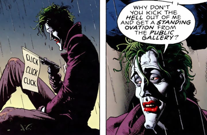Something interesting about The Joker? We never see the guy on his lonesome. We never see him when there is no show to put on, no façade to mask himself.