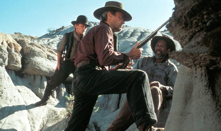The plot surrounds an aging gunfighter named William Munny (played by Eastwood), who attempts to abandon his past life as a criminal, by becoming a hog farmer in Kansas. Though, when he befriends a young bounty hunter nicknamed “The Schofield Kid” (played by Jaimz Woolvett) and hears news of a teenage prostitute being violently assaulted and disfigured by two cattlemen in Wyoming, as well as a $1,000 bounty being placed on their heads. William Munny hesitantly brandishes his old guns once more in order to offer his children a better life; riding to Wyoming with the bounty hunter as well as Munny's old partner in crime, Ned Logan (played by Morgan Freeman). Furthermore, they must confront the wanted men who are also being persued by another competing gunfighter named “English” Bob (played by Richard Harris) as well as a posse of corrupted lawmen, commanded by Sheriff William "Little Bill" Daggett (played by Gene Hackman).