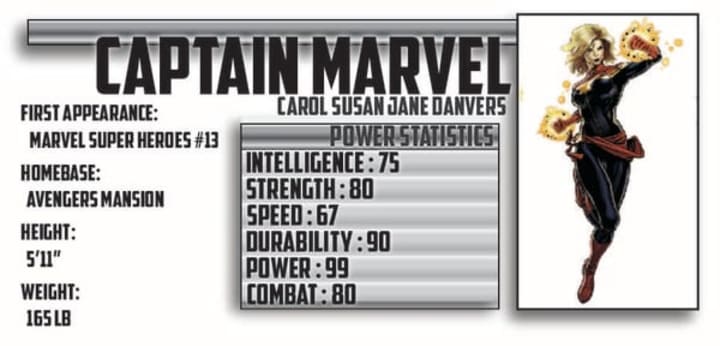 Statistical History: Captain Marvel didn't always have her superpowers, she grew up under a disapproving father and in turn it forced her to choose to pursue a military career to earn her college degree. She joined the Air Force against her families wishes. Quickly rising through the ranks, Carol was recruited into military intelligence and trained as a spy. During this time Carol operated on several missions with characters like Logan Howlett (Wolverine) and Ben Grimm (The Thing) both before gaining their own unique abilities. Carol eventually proved herself and was requested by NASA for a position as head of security. It was as chief of security that Carol met the Kree soldier Mar-Vell as he was posing as a scientist at the base, Dr. William Lawson. Before gaining her powers she was: kidnapped by an alien robotic intelligence, hospitalized by a controlled Iron Man then kidnapped by Yon-Rogg and thrown into the Kree device the Psyche-Magnitron thus altering her genetic structure. [source: Marvel Wikia]