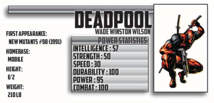 Statistical History: Deadpool is by definition a wildcard. Wade Wilson, as he was previously known enrolled in the Weapon X program where he gained his healing ability from Wolverine. He joined the program to bring out superhuman enhancements, but was rejected from the program after killing his teammate. Sent to the Hospice, which was where failed operatives were sent to be treated. The Hospice, unbeknownst to the Canadian government the rejects were tortured and tested on by Dr. Emrys Killebrew and his muscle, Ajax. After killing a fellow patient (out of the prompting of Death), Wilson was to be executed. Ajax tore out his heart and left Wilson for dead. Wilson's vengeance would not be stopped there and his healing factor would regenerate his heart. Wilson escaped and unloaded 2 automatic rifles into Ajax leaving him for dead. Wilson then began working for hire for various agencies and villains alike. He had no preference of who hired him as long as they didn't get in his way. [Source: Marvel Wikia]