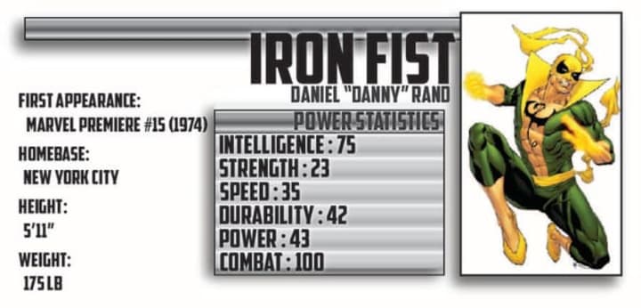 Statistical History: Danny Rand had a rough go of it as a child. Orphaned as his father was murdered by his business partner, and his mother killed by a pack of wolves- all in the same night. Danny was rescued by the people of K'un-Lun as that is where Danny's family was headed. Danny was apprenticed to a martial arts master named Lei Kung the Thunderer. Danny's training was never-ending, and paid off in the end. Danny conditioned his body for several years before finally given the opportunity to claim the power of the Iron Fist by battling an fire-breathing serpent, Shou-Lao the Undying. [Source: Marvel Wikia]