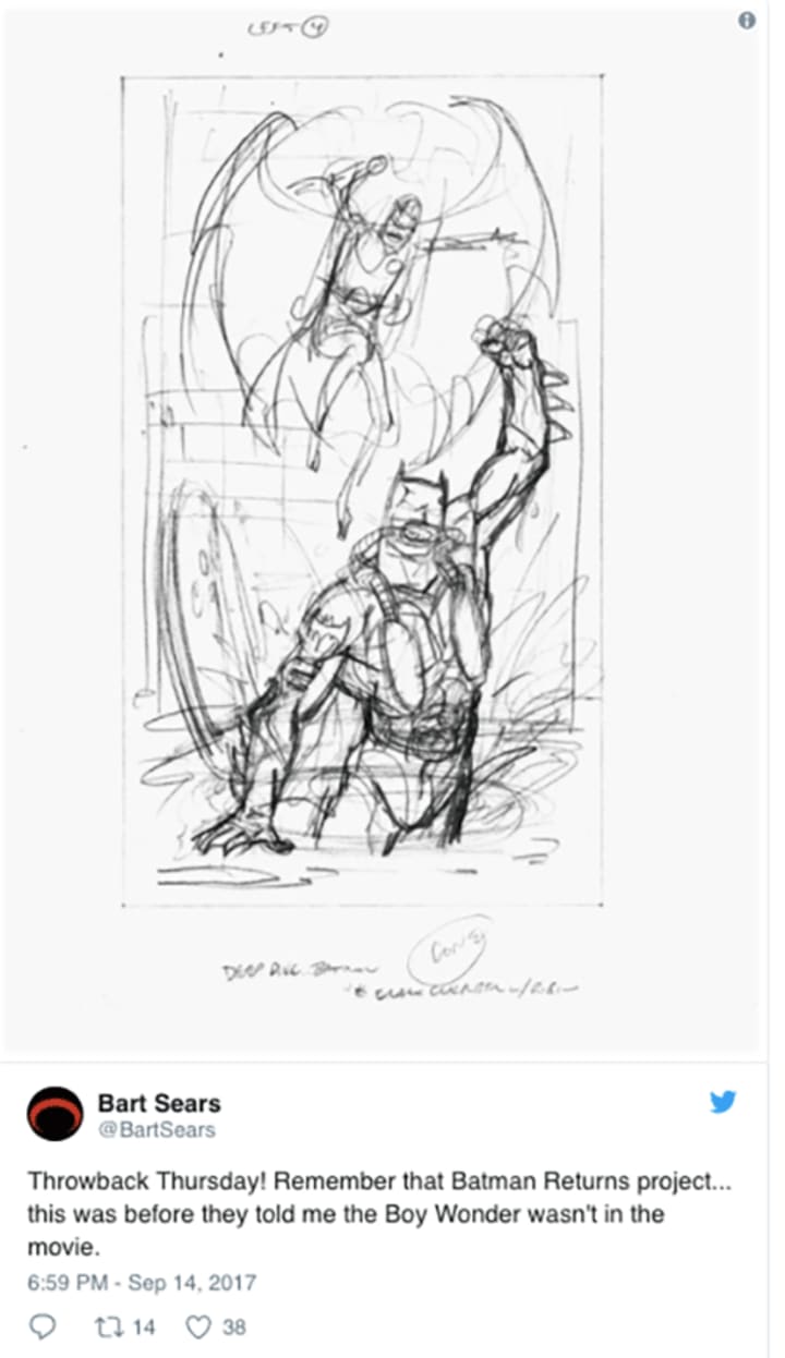Most notably, plans to include Robin and Two-Face were scrapped mid-film to make way for a more streamlined outing. It would've really put the Catwoman among the pigeons to have the dynamic duo, Max Shreck, Penguin, Harvey Dent, and Selina Kyle all go head to head, so a toned-down cast of characters may have worked in the film's favor. Now #comicbook artist Bart Sears has shared some long-lost sketches of how Robin was supposed to take flight over the crime-riddled streets of Gotham City.