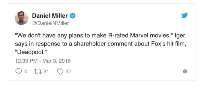 Meanwhile, Disney seem committed to keeping the MCU films strictly PG-13. Even Deadpool's remarkable success hasn't changed that: