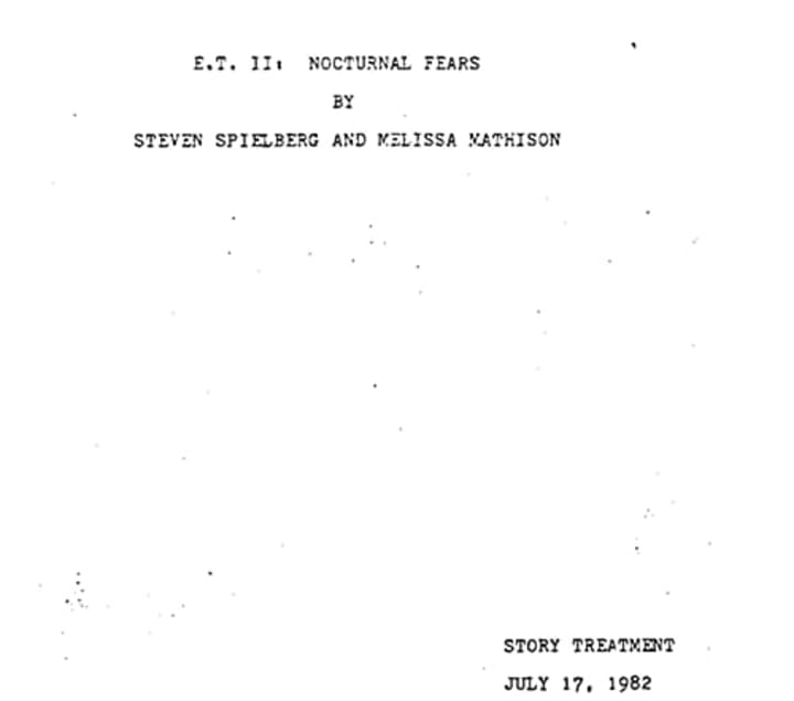 Earning $600 million on its first theatrical run, Spielberg would have been stupid not to at least consider a sequel to E.T., taking Elliot and Gertie along for the ride too; and so E.T. II: Nocturnal Fears was born. The film's original writer, Melissa Mathison — who sadly passed away in November, 2015 — teamed up with Spielberg and whipped up a treatment for Universal, developing a plan for a film so shockingly bad it is concerning that it nearly got made. Along with the rumored E.T./Atari graveyard, E.T. II: Nocturnal Fears has long since been buried in the memories of studio execs and even Spielberg himself. This is how it could have gone down!