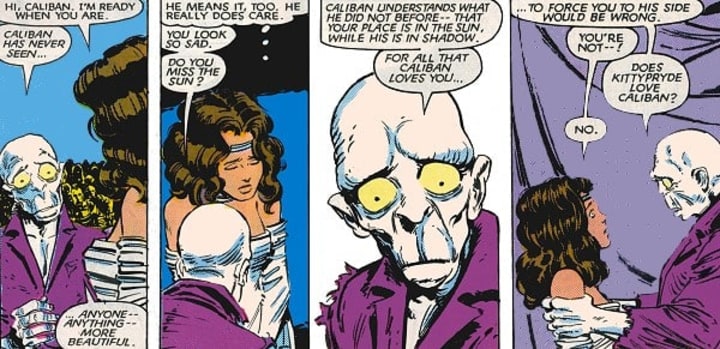 The Morlocks frequently butted heads with the X-Men, and it's in one such confrontation that Caliban comes to take care of Kitty Pryde when she is infected with a virus. He develops feelings for her, and allowed Kitty to leave to fight with her friends on the condition that she stays with him forever. When Kitty fails to return, Callisto orders the Morlocks to kidnap her and force her to marry Caliban. It's at this moment that he realizes that she did not truly love him, and he allows her to leave for good.