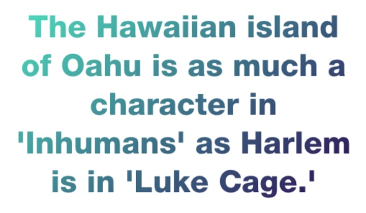 Inhumans has come in for a lot of criticism, but there's one thing it does do well and that's create a strong sense of place for the island of Hawaii. The Hawaiian island of Oahu is as much a character in Inhumans as Harlem is in Luke Cage. The plot moves us from Diamond Head to Honolulu, providing viewers with a wonderful whistle-stop tour round the island. The gorgeous setting is perfectly suited to IMAX camera technology, and we're shown some stunning panoramic views. Given the amount of care that Inhumans has taken in creating such a strong sense of place, it's essential that Hawaii remain integral to the ongoing story of the Inhumans.