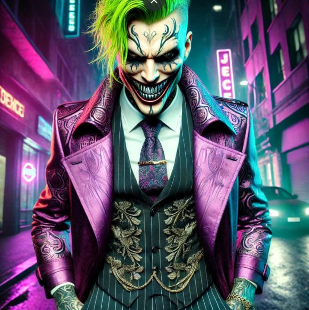 - Look & Style: The bright green slicked-back hair, the pale white skin, and the eerie, shark-like grin mirror the Joker seen in many of DC’s animated adaptations. The flashy, purple-gangster aesthetic pays homage to comic book versions where the Joker is often depicted as a twisted crime lord.